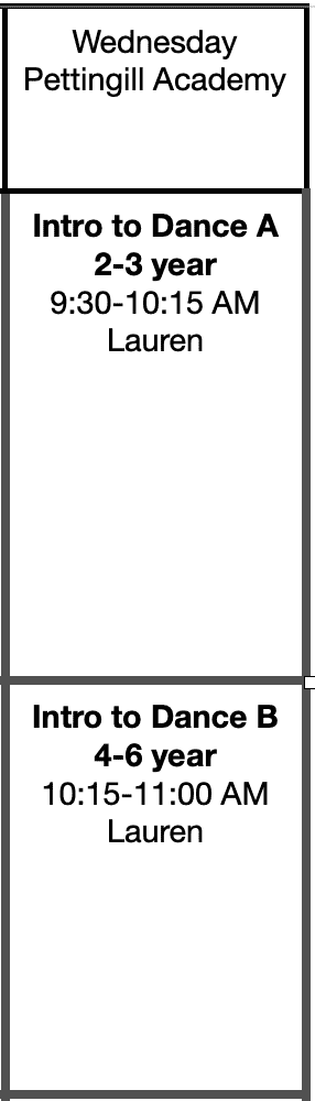 Our Intro to Dance levels include ballet, jazz, tap, and modern dance technique appropriate to the child’s age and level. The program introduces children to rhythm, choreography, stretching and strengthening. A great deal of emphasis is placed on enjoyment of the art of dance while maintaining the discipline required for any artistic endeavor. Attire: Girls – Leotard, skirt or fitted shorts, split sole canvas pink ballet slippers. Attire: Boys – White fitted shirt, black tights or stretchy pants, black ballet slippers
