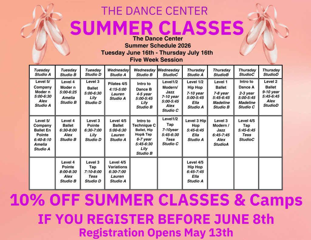 10% Off Summer Classes, Camps and Intensives if you register before June 8th Promo Code: summer26